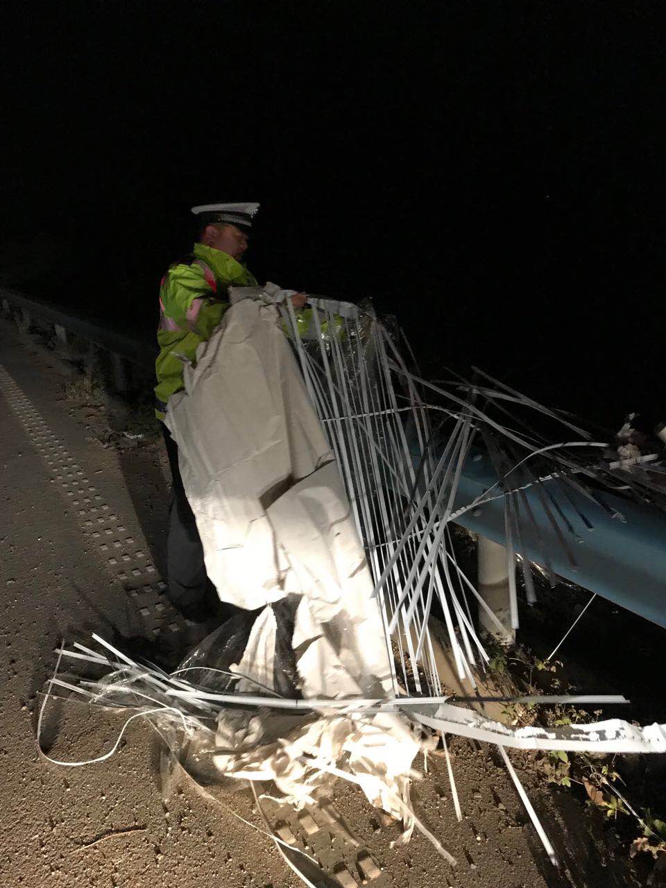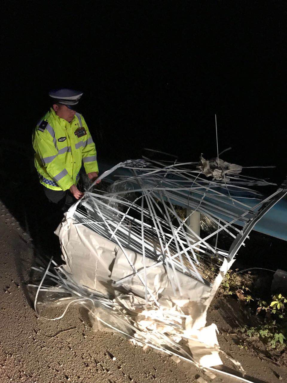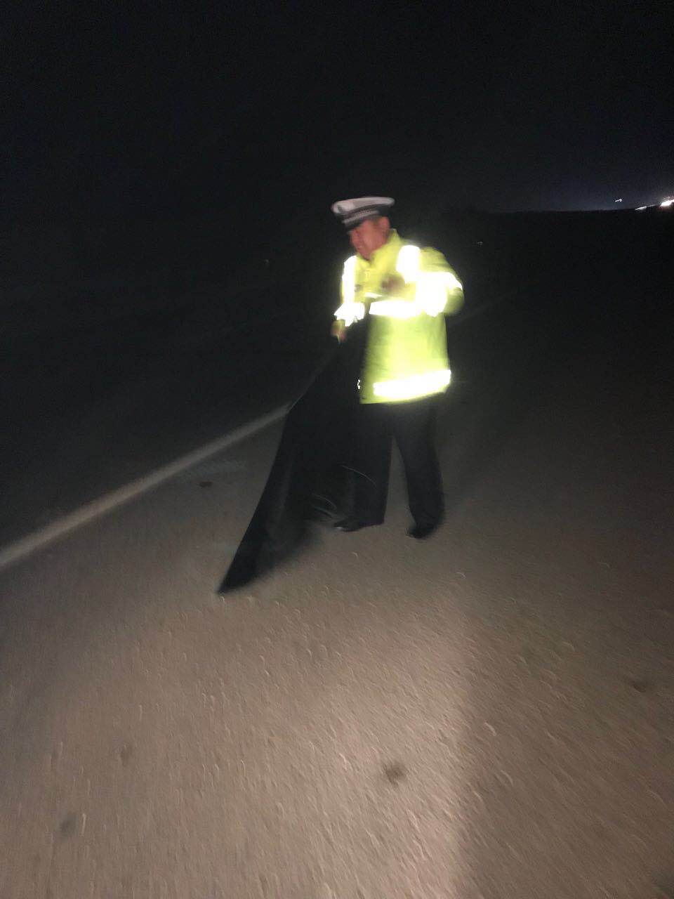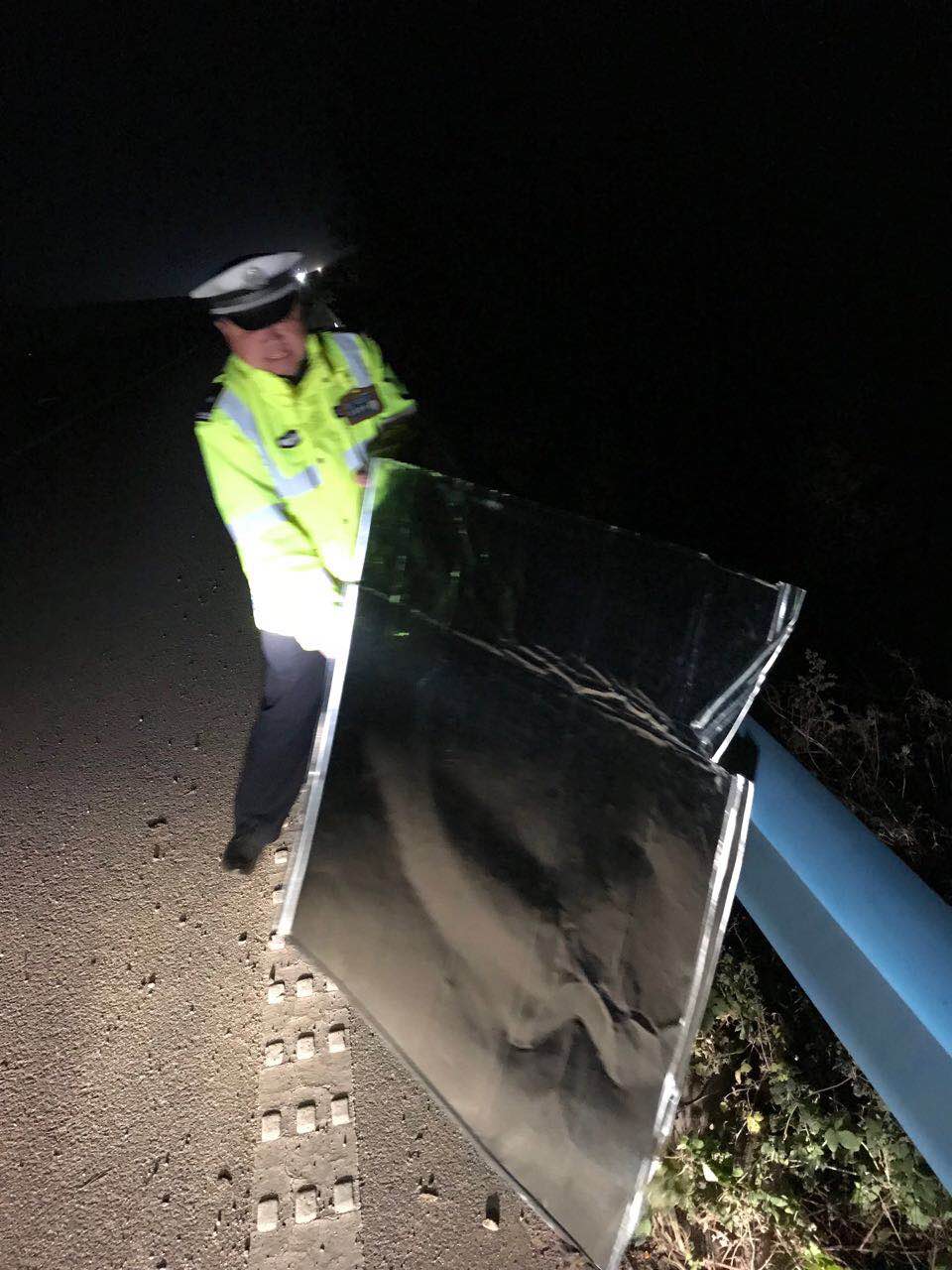 10月19日晚21时54分,兰南高速15公里西半幅,开封高速执勤民警朱刚巡逻至此处,发现路面有一堆障碍物静躺,影响过往车辆通行,夜间行车视线差,极易引发交通事故,我队民警立刻快速清理路障,排除隐患,保障道路交通安全。